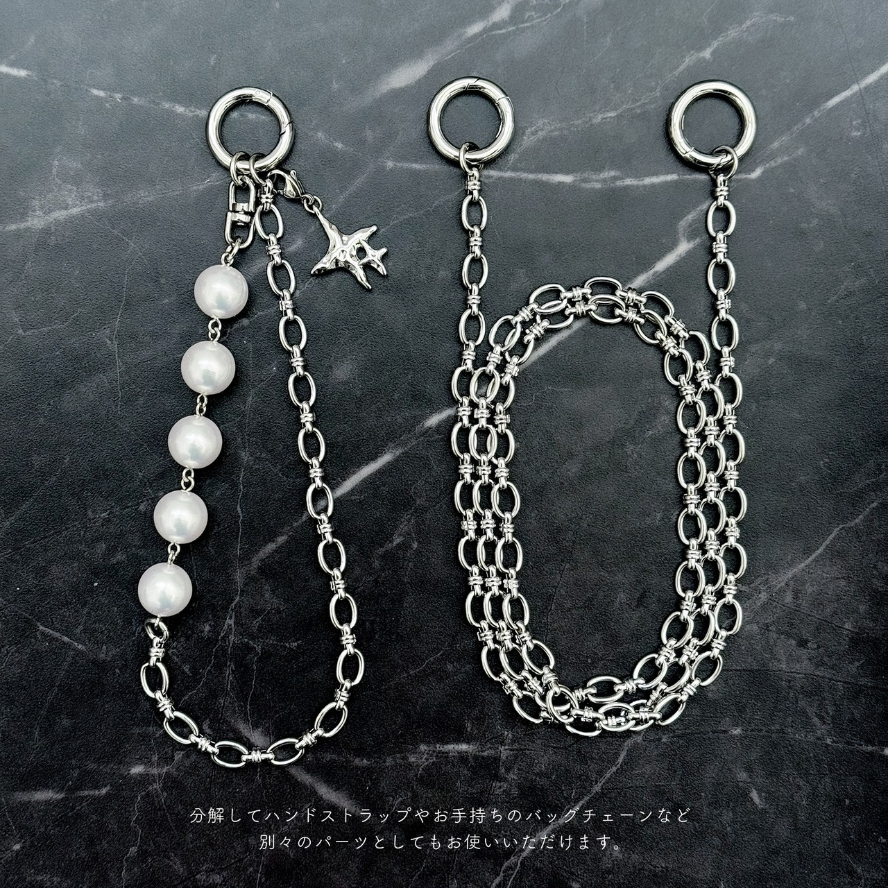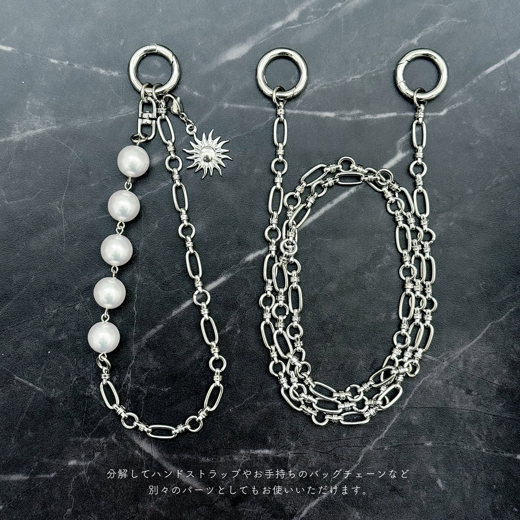 また接続用金具には丸カラビナを使用しているので、バッグや服につけてコーディネートのワンポイントとして,また(お手持ちのバッグ等の仕様によっては)バッグの持ち手としてなど、マルチにお楽しみいただけます◎