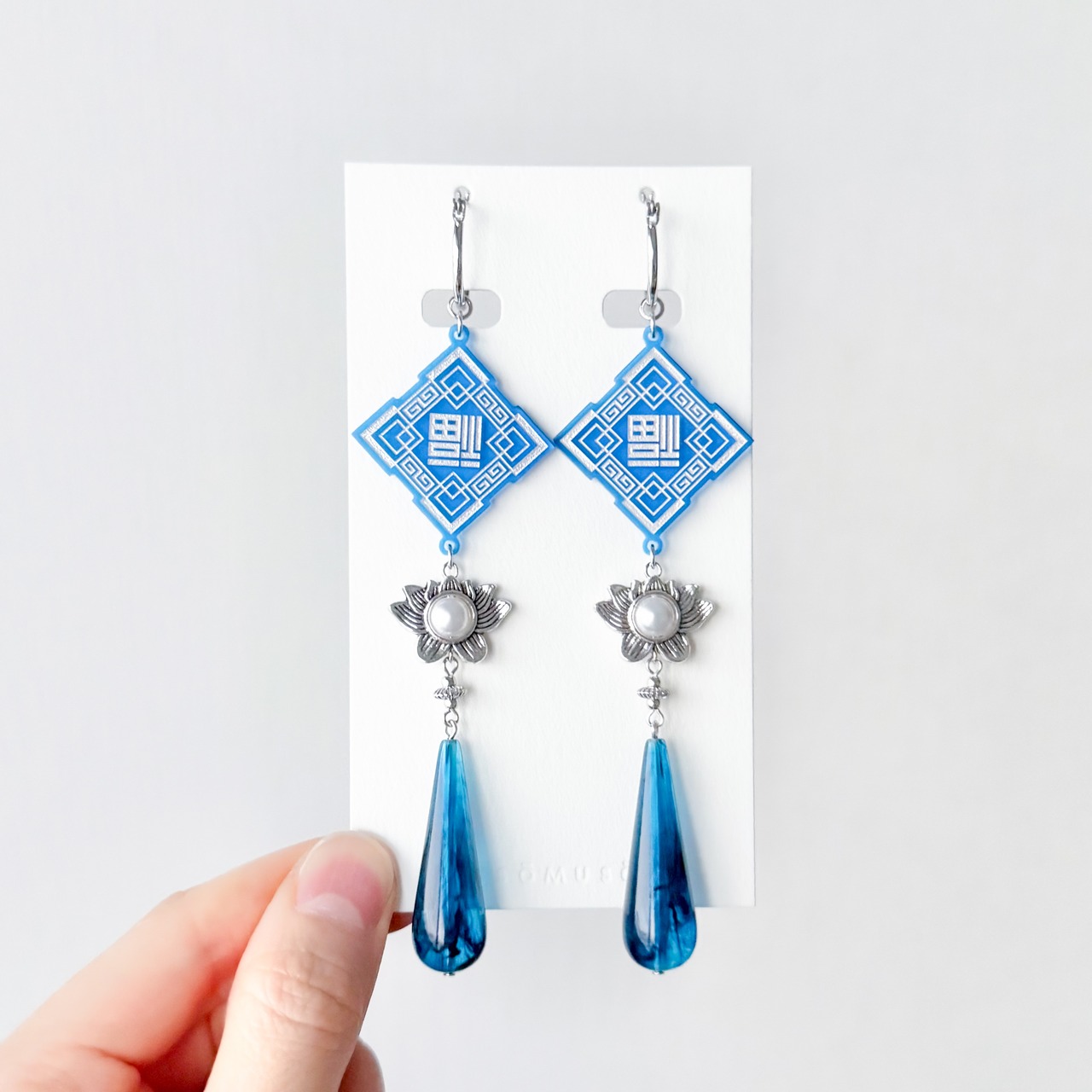 存在感のある大振りデザインと透け感のあるブルーで、コーディネートのワンポイントになるような耳飾りです。