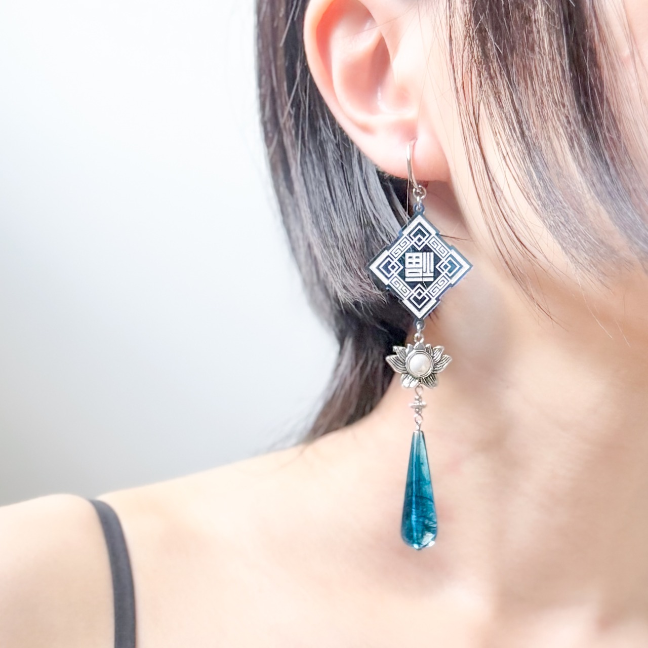 中華文化圏で縁起が良いとされる[倒福]のモチーフをusomusoらしいモードなデザインに落とし込み、耳飾りに仕立てました。