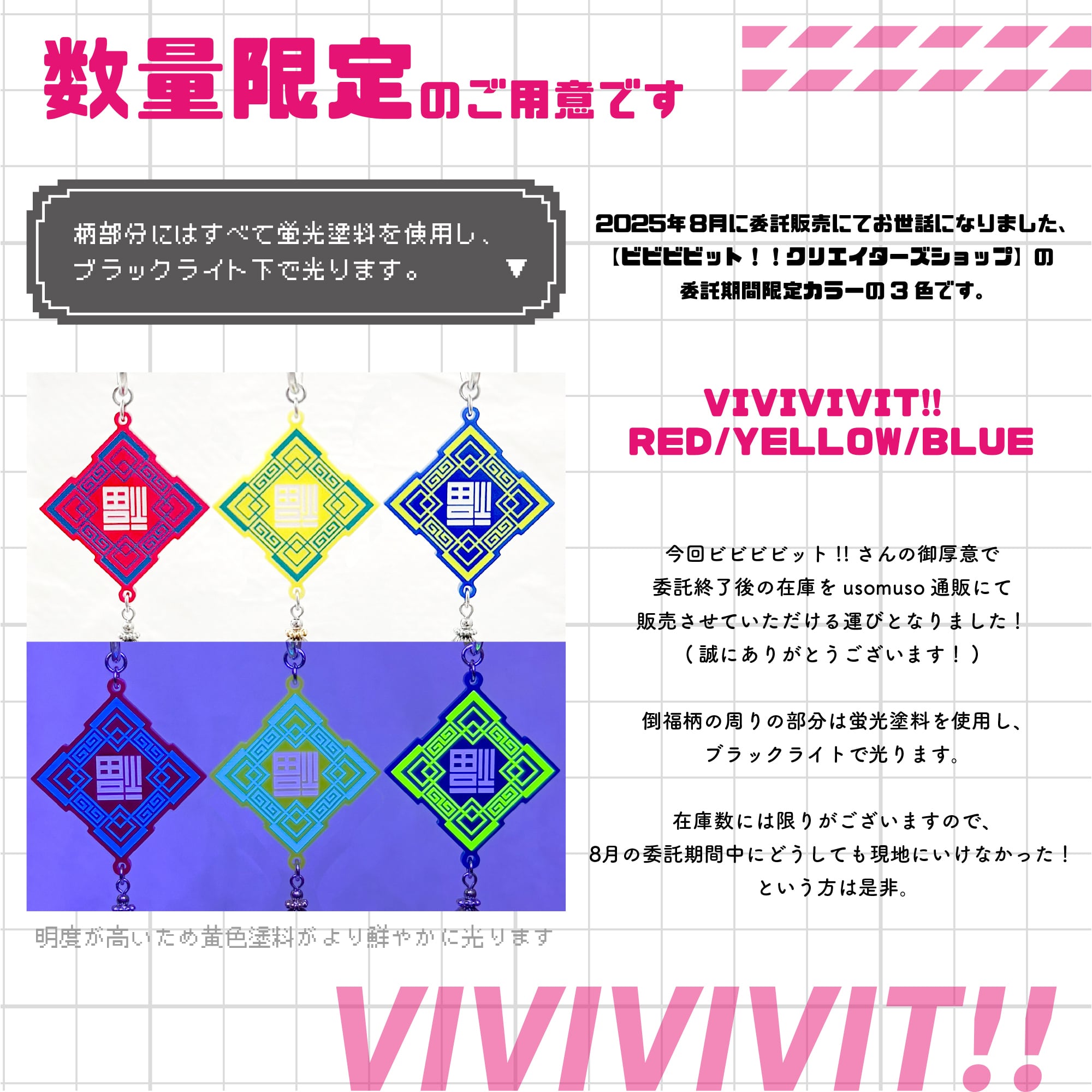 2025年8月に委託販売にてお世話になりました、名古屋【ビビビビット!!クリエイターズショップ】様の委託期間限定カラーの3色です。
