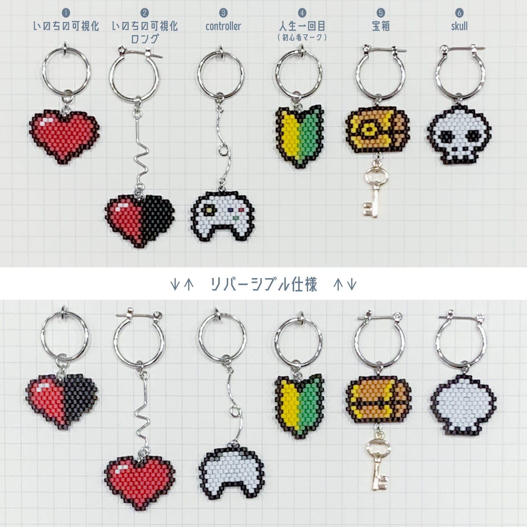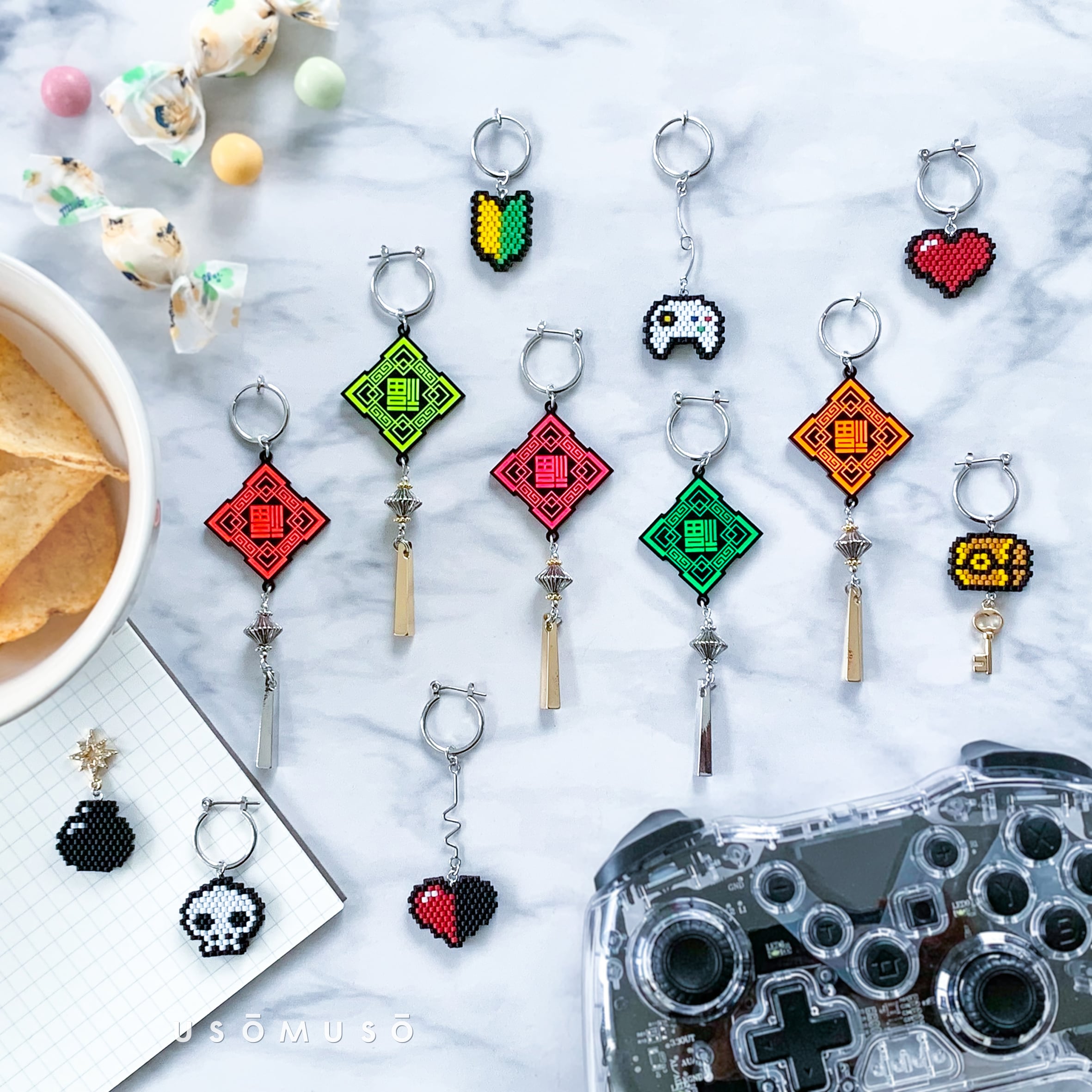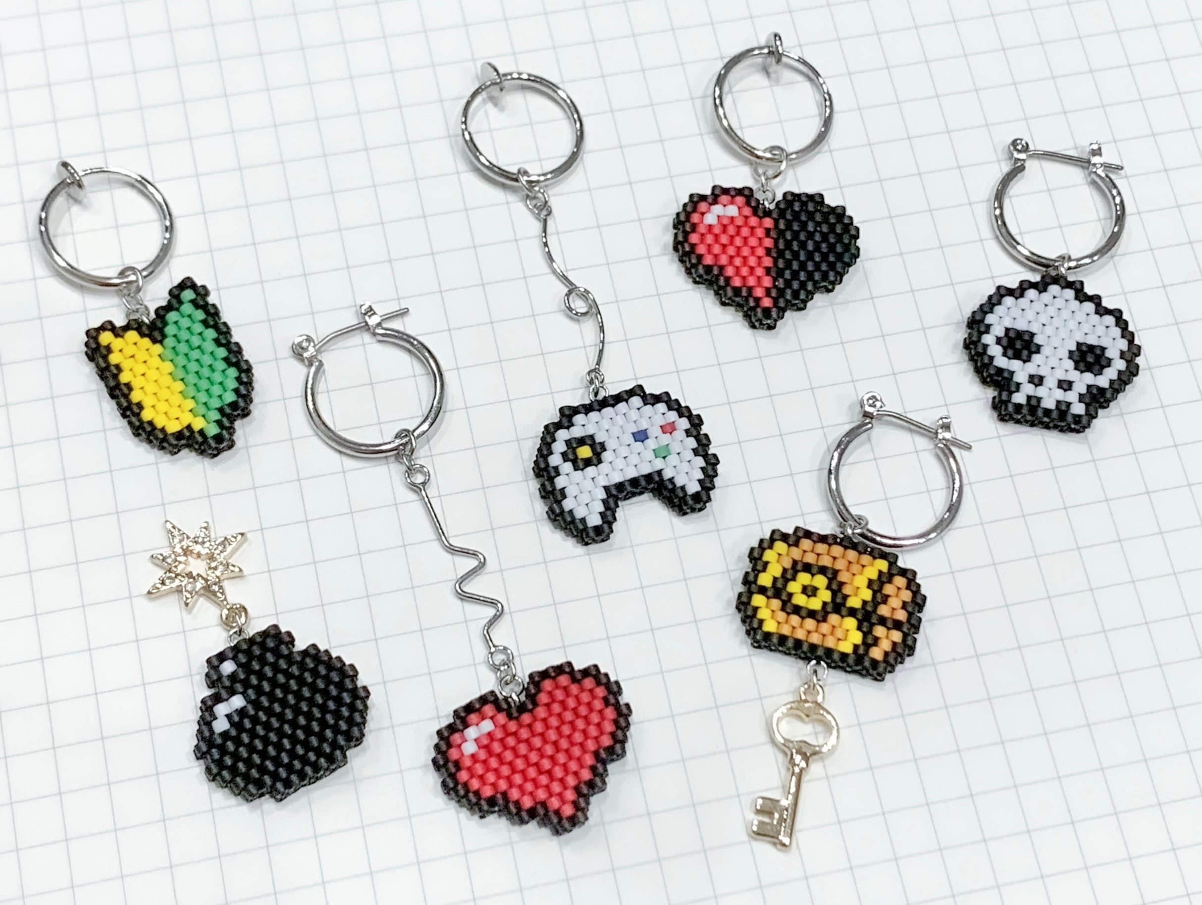 ゲームに出てくるようなモチーフを、デリカビーズを一粒一粒糸と針で編み上げる"ビーズステッチ"という手法で制作。
